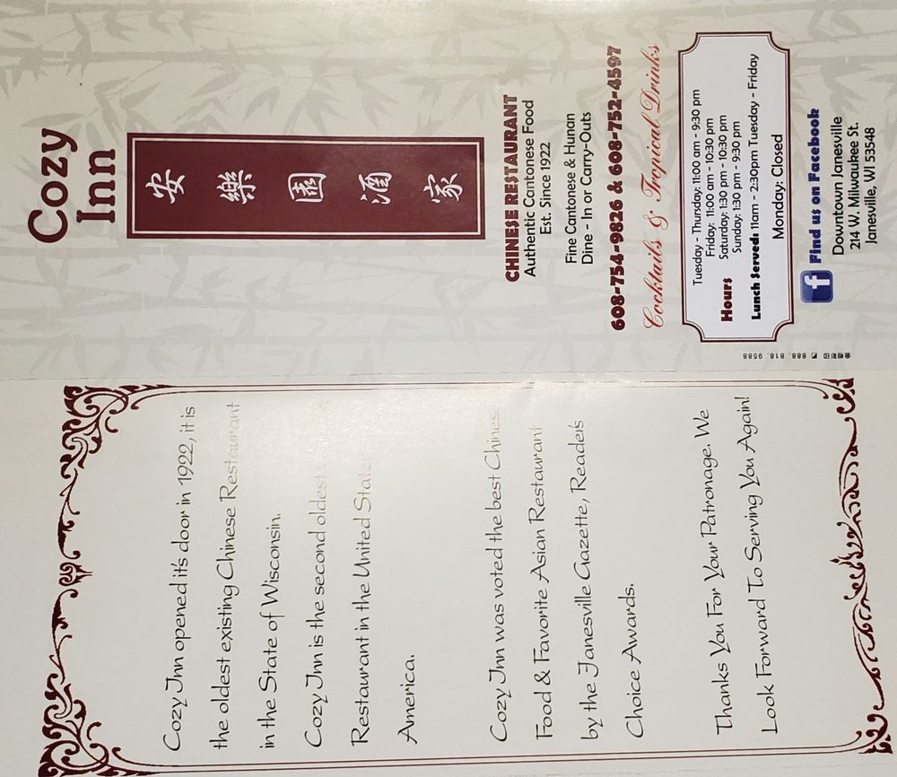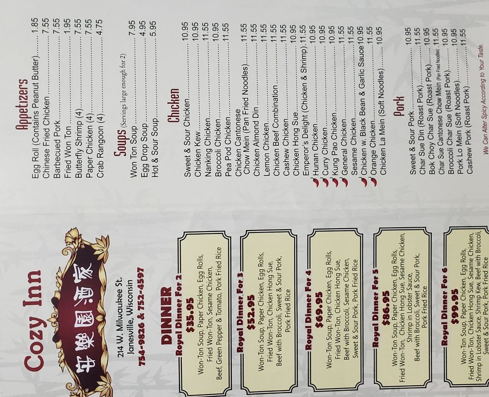 Welcome to Cozy Inn Chinese Restaurant, where the essence of Asian fusion meets comforting ambiance in the heart of Janesville, WI. This charming eatery promises delightful dining experiences for lunch and dinner, boasting a menu crafted to cater to diverse palates.